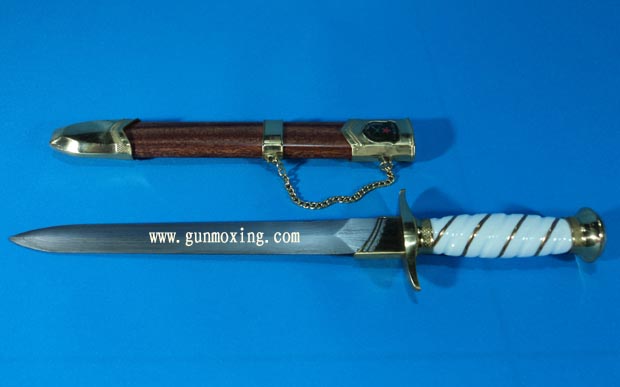 礼宾剑详细介绍: 礼宾剑的设计参考了各国军用刀剑的特长,并结合我军传统的历史文化,保持了中国剑独有的直脊双刃特点,造型大方、威武典雅,是实用与艺术的完美结合。 礼宾剑主要饰件均采用纯铜铸造,剑身采用古典华丽的花纹钢,经纯手工反复折叠锻打,使剑刃更加坚韧锋利,剑身现出精美奇特的折叠纹。手柄采用国外流行的骨瓷材质制作,釉面光滑柔和,高贵典雅。精铸纯黄铜护手,表面抛光处理。剑鞘采用核桃木制作,内衬软木,正上方镶嵌银色盾牌。配以高档实木制作的剑盒,彰显尊贵。 完全采用真材实料打造的礼宾剑,无论是造型设计,还是材质的搭配上,都做了精心的安排,使之完美无缺,是军人收藏和馈赠好友的最佳礼品。 说明:本公司经营之礼品刀剑为礼品、收藏品,均未开刃。