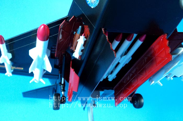 该模型为合金制作歼31战斗机仿真模型,比例为1:36,全长45.5cm,重量3.2kg,可以摆放在桌面等地方及使用支架摆放。飞机模型的驾驶员舱门盖可打开及关闭,尾翼、升降舵、垂直尾翼均可仿真动作,导弹仓门可打开及关闭。