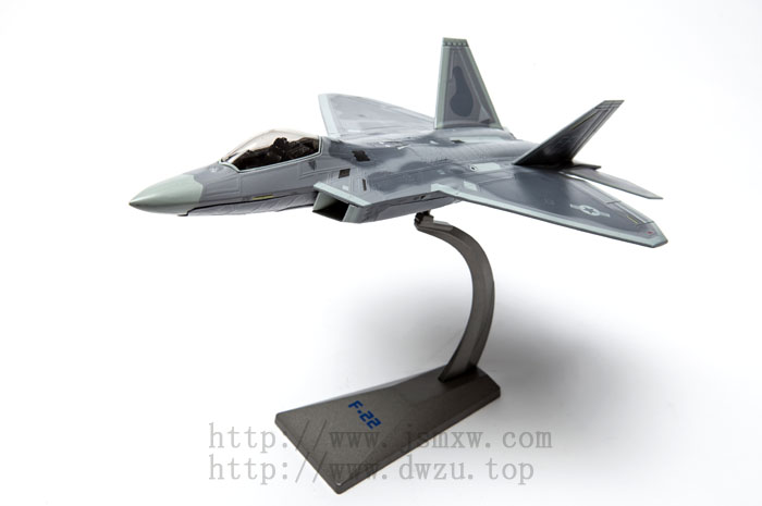 F-22猛禽战斗机模型,采用优质锌合金制作,制作比例为1:72,飞机模型的长度26cm,翼展19cm,含底座高度19cm,净重1.6kg。飞机的驾驶舱盖可以打开、起落架可以打开及收起,导弹仓盖可以打开及关闭。整架飞机的金属质感非常强烈,呈现惊艳的逼真效果。飞机可独立放在平面摆放,也可安装在专用支架上摆放。