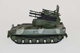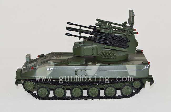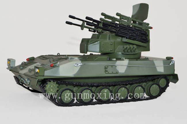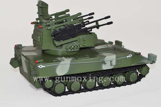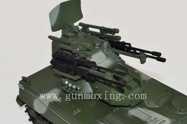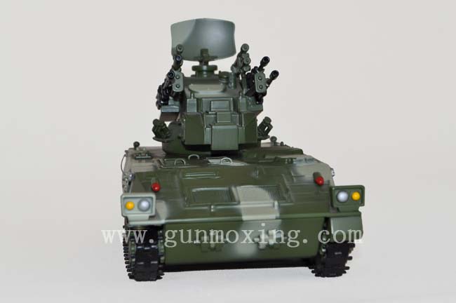 此款精缩比例为1:30的合金仿真模型车,以我国95履带式自行弹炮合一防空系统为原型。车体及炮塔均为合金制造,炮塔可360度旋转,炮口能上下摆动。履带可以灵活转动,且车轮具有减震效果。驾驶舱、弹炮装备和烟雾弹发射器均详细做出。