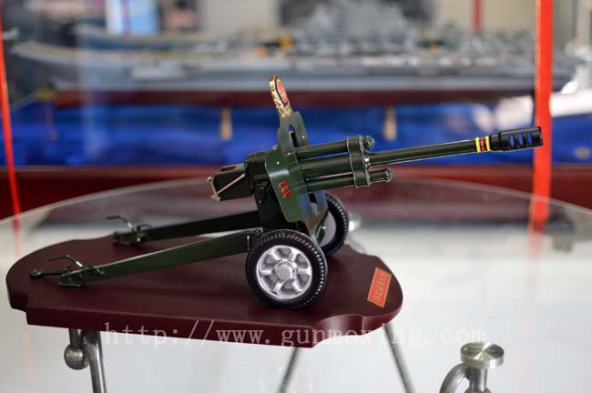 此款模型是以建国60周年国庆大阅兵庆典仪式上天安门前08式迎宾礼炮为原型,按1:10的比例制作而成,配木质底座。礼炮模型采用合金铸造及精密机加工,炮管能上下摆动及定位,轮胎可以滚动,炮架可以仿真移动,炮闩、击发手柄、高低射界摇把、牵引杆等均详细做出。