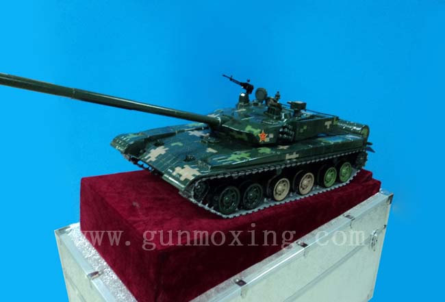该模型为全金属制作,比例为1:10,长度1.15米,重量超过30kg,颜色数码迷彩,铝合金箱包装,履带可转动,舱门盖可打开,炮塔360度旋转,炮筒可俯仰摆动。