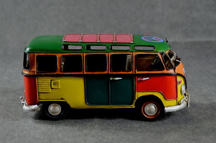 此模型是复古铁艺模型,制作材料为马口铁。模型严格按照60年代大众彩色巴士的车型和涂装制作,车体外部涂装进行了专业化做旧处理。模型长宽高分别为27cm、11.5cm、14cm。 此模型适合爱好者收藏、商务礼品、纪念展馆展品、场景装饰等用途。