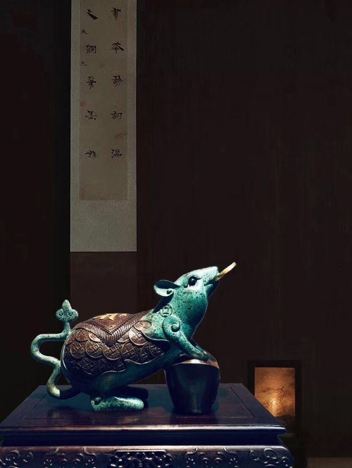 福鼠临门 ——满载而归 鼠具有无比灵性,聪慧神秘,与“书”“数”谐音,寓意学业有成,财源滚滚。 材质:国标级精黄铜 工艺:艺术品失蜡法精密铸造,纯手工雕刻打磨,表面热处理氧化天然彩铜肌理,【杜绝二次化学漆,丙烯颜料】福字等采用尼泊尔传统鎏真金工艺(纯金99.99)。天然肌理让你零距离接触铜质感 尺寸:长26cm 宽11cm 高18cm 重量:5.1斤