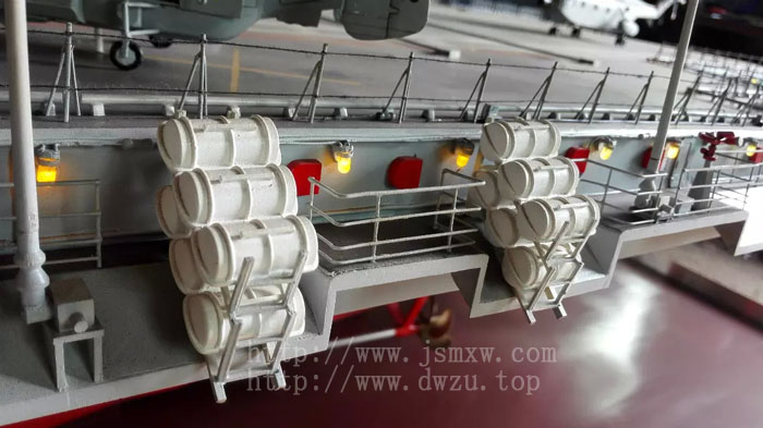 模型对航母的外部细节制作非常详细,船上的每一个栏杆,每一扇窗子,每一个梯子,升降机、卷扬机、船上的监控摄像头、没一盏灯、船体上的扶手、舱门把手、扬声器等所有船体细节都详细做出;船上设备包括密集阵防控系统,各种导弹及其他武器系统,各种雷达及天线,飞机拦阻索,甲板上的所有设备均按照辽宁舰设备状态做出。